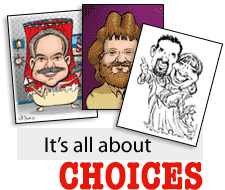 Here at Goofy Faces, we offer several choices when it comes to picking the right caricature for your needs. We have what you want for any occasion in color or black & white. Want to add a cute caricature to your wedding announcement? No problem. Looking for a unique personal gift that everyone can sign? We have that. Do you need a caricature illustration for your business? Look no further! We offer all that and much more. Check out our Caricature Packages page to see what we have for you right now. And if you dont see what youre after, please contact us. We can create a custom caricature thats just right for any occasion.